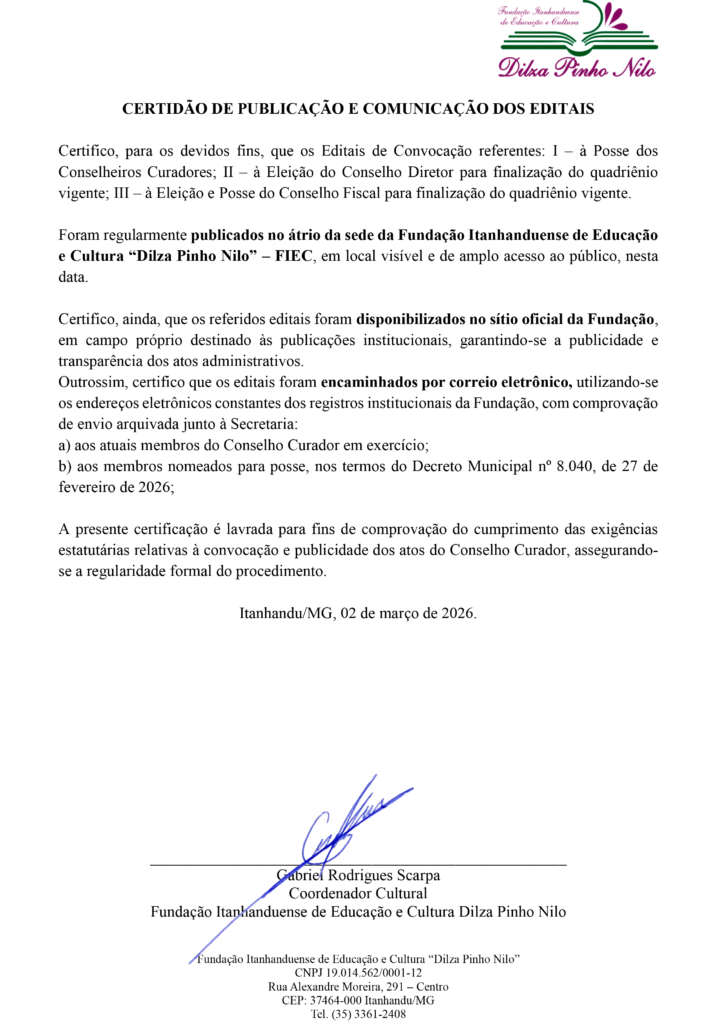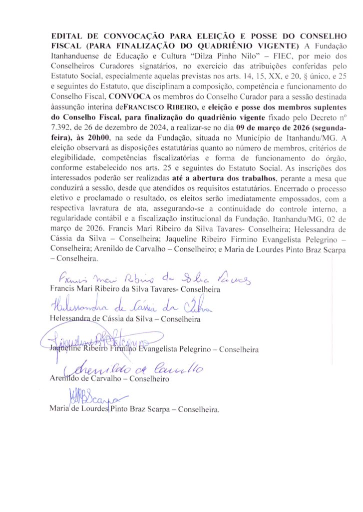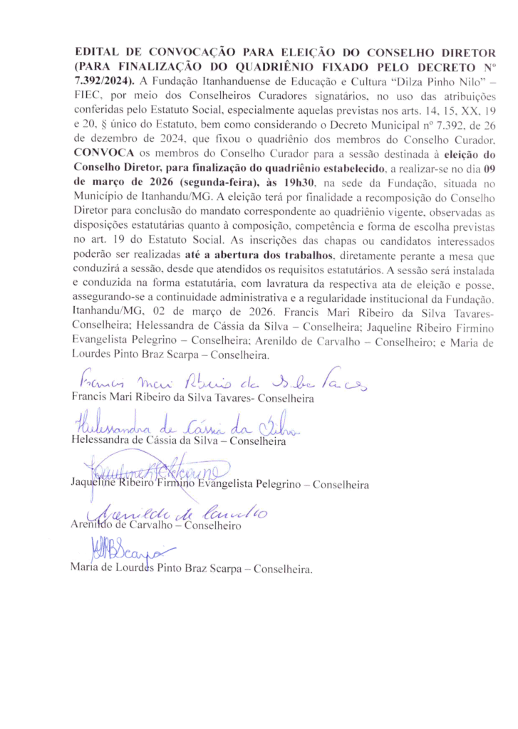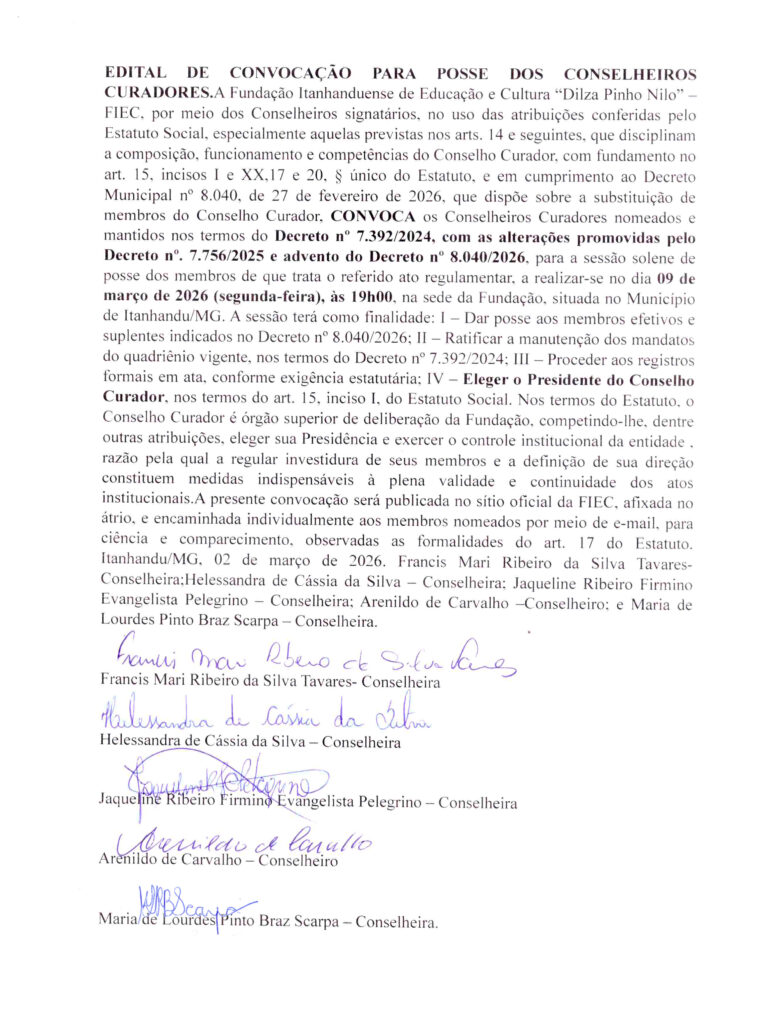 O Conselho Curador da Fundação Itanhanduense de Educação e Cultura “Dilza Pinho Nilo”, no uso de suas atribuições estatutárias e em cumprimento às disposições legais e regimentais vigentes, torna pública a presente divulgação dos Editais de Convocação devidamente assinados pelos Conselheiros Curadores, referentes às sessões a serem realizadas no dia 09 de março de 2026, às 19h, na sede da instituição, no Município de Itanhandu/MG.