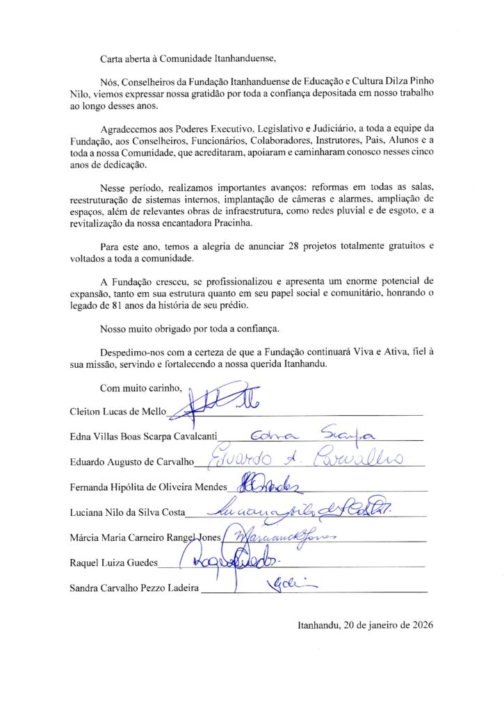 A Fundação Itanhanduense de Educação e Cultura “Dilza Pinho Nilo” manifesta seu sincero agradecimento aos membros do Conselho que apresentaram suas renúncias no dia 22 de janeiro de 2025.